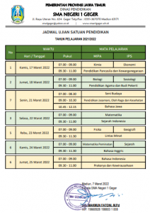 USP dilaksanakan oleh semua lembaga sekolah tak terkecuali SMAN 1 Geger. USP di SMAN 1 Geger dilaksanakan tanggal 17-25 Maret 2022. Peserta USP adalah semua peserta didik kelas XII dari pogram MIPA dan IPS.