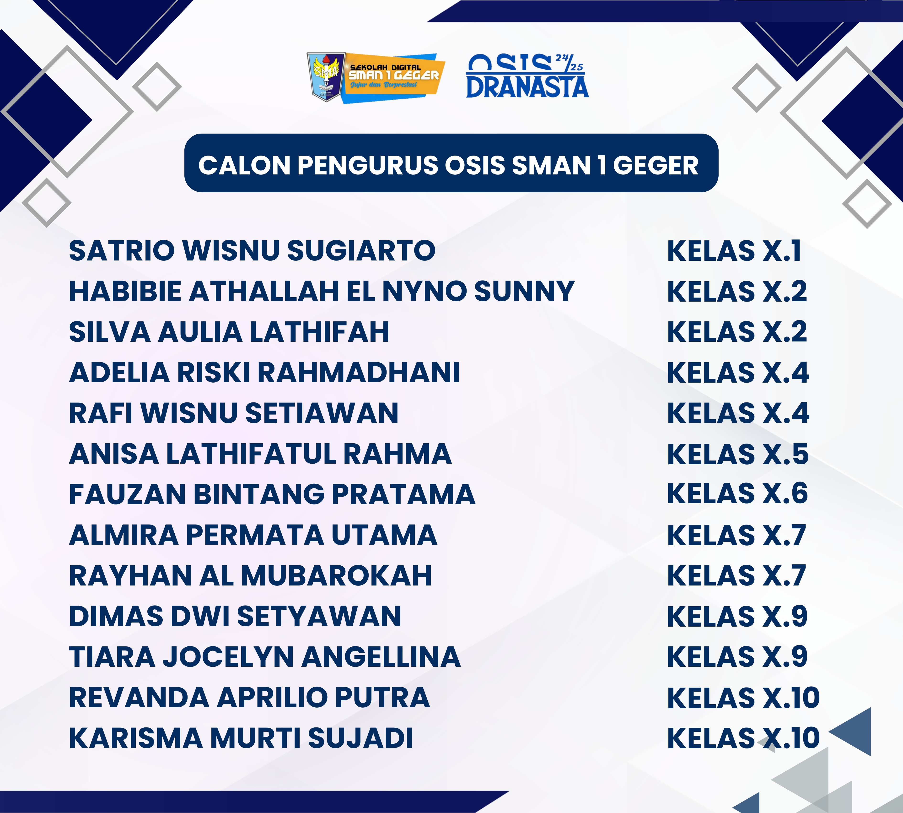 Selamat kepada peserta yang berhasil lolos. Semoga amanah yang diberikan dapat dijalankan dengan komitmen, integritas, dan semangat untuk membawa OSIS serta SMA Negeri 1 Geger meraih prestasi yang lebih gemilang.