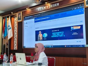 Acara kemudian berlanjut pada sesi pemaparan materi. Bapak Lathif Zamroni, S.Kom., M.Pd menyampaikan materi mengenai implementasi digitalisasi sekolah di SMAN 1 Geger. Selanjutnya, dua perwakilan siswa, Farisa Fernanda Aulia dan Setya Elica Frederica, turut berbagi pengalaman mereka dalam menggunakan e-learning Moodle, baik untuk mendukung pembelajaran maupun untuk kegiatan OSIS dan MPK.